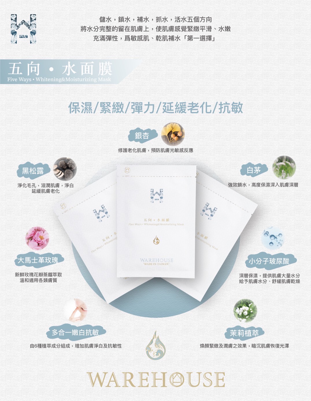 這是一款多效合一的面膜,保濕/緊緻/彈力/延緩老化/抗敏都可以達到,添加黑松露、大馬士革玫瑰純露、白茅,茉莉等多種珍貴植萃,並從儲水,鎖水,補水,抓水,活水五個方向將水分完整的留在肌膚上,使肌膚感覺緊緻平滑、水嫩充滿彈性,爲敏感肌、乾肌補水第一選擇☝️